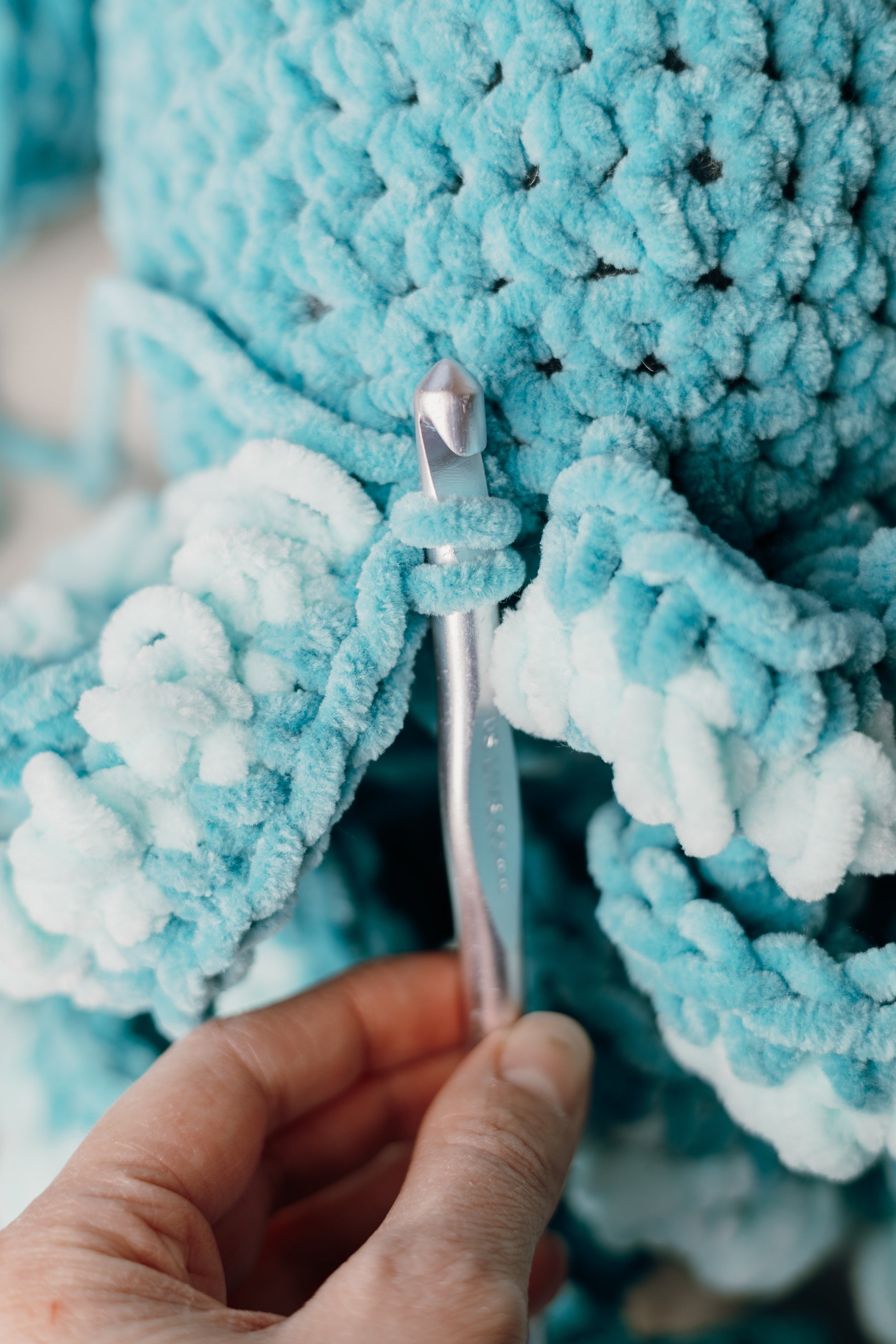 I used Universal Yarns - Bella Chenille in Coastal and Honeydew. There are many yarn manufacturers who made chenille yarn - so I'm sure you can find a suitable substitute.