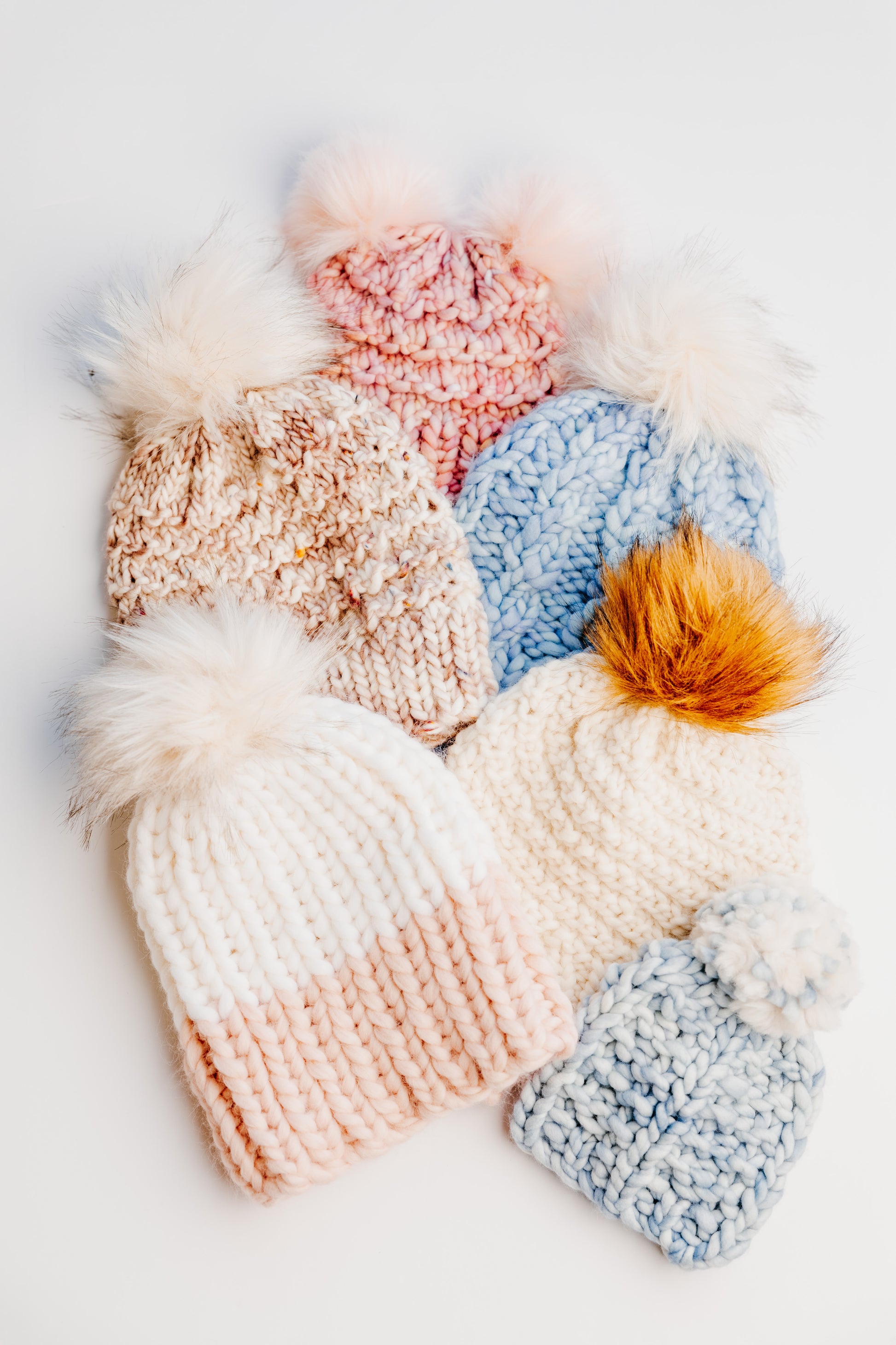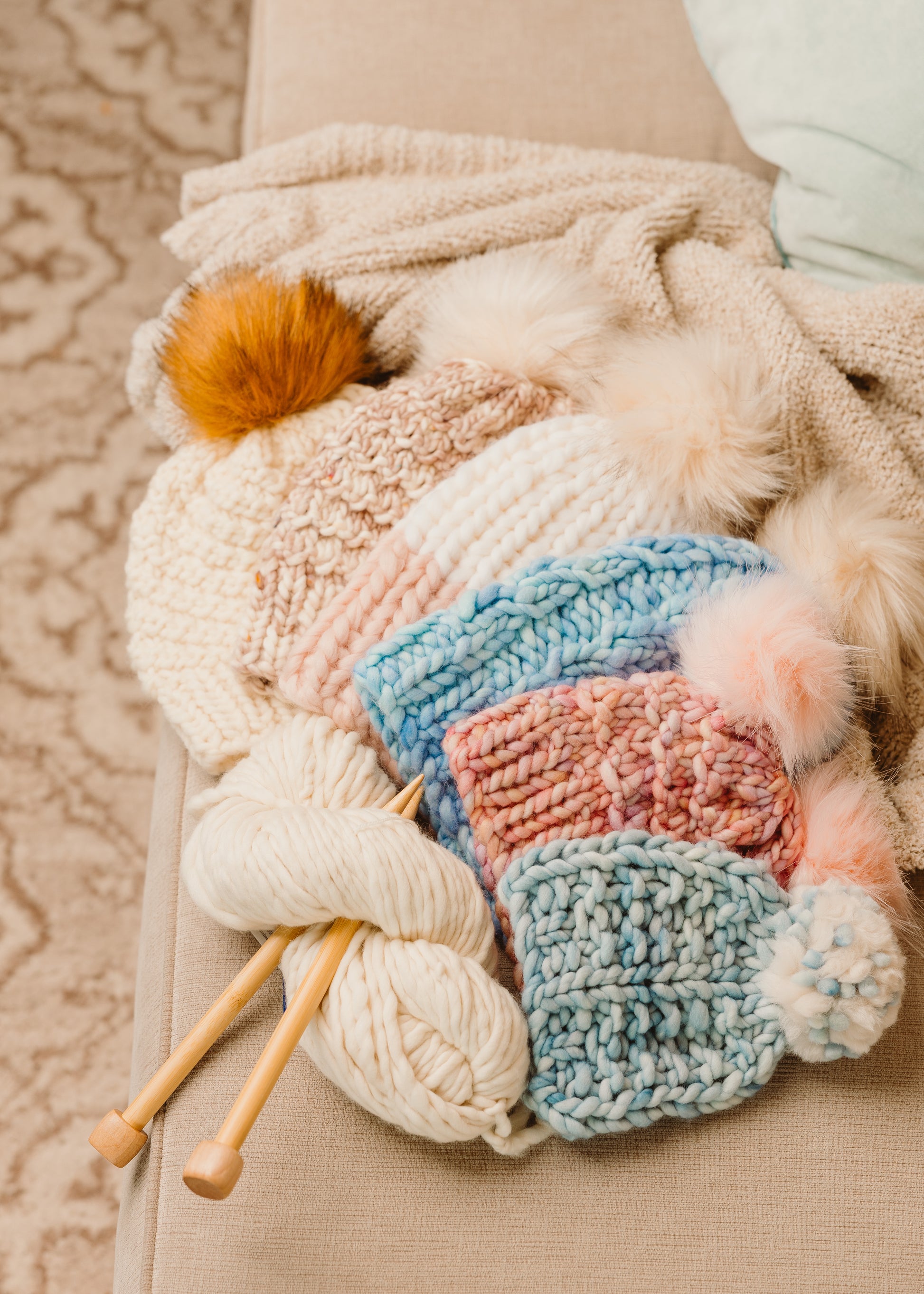 You must know the basics of knitting and be able to follow basic knitting instructions for these patterns, and know how to decrease. You will need extremely bulky (think the big sexy wool), super bulky, bulky, or light bulky yarn (I like malabrigo yarns), size 10.75, 11, and 13, 15, and 17 US knitting needles, a tapestry needle, faux fur pom poms, buttons, and scissors.