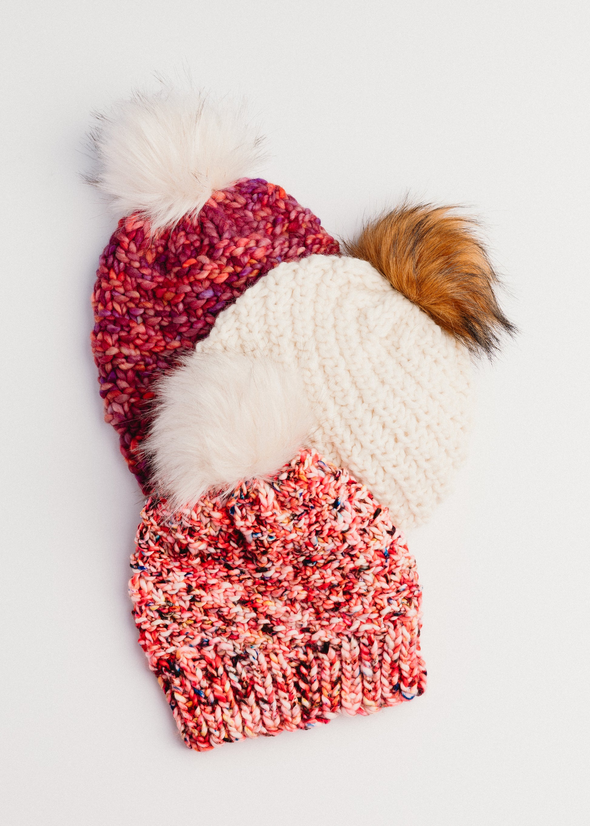 You must know the basics of knitting and be able to follow basic knitting instructions for this pattern, and know how to decrease. You will need super bulky, bulky, or light bulky yarn (I like malabrigo yarns), size 10.75, 11, and 13 US knitting needles, a tapestry needle, faux fur pom pom, button, and scissors.